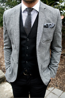 Tip: Your three piece suit can be working in many ways! Why not replace your suit jacket with a tweed blazer when its cold out. Its still formal enough for work and has practicality.